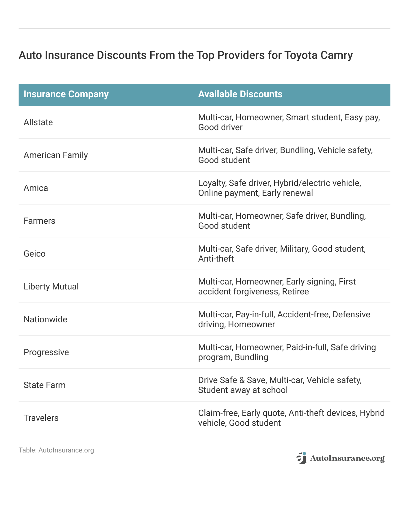 Many insurers offer discounts for Toyota Camry owners, such as multi-car, safe driver, or low-mileage discounts. It’s best to inquire with your insurer about all available auto insurance discounts to maximize savings.