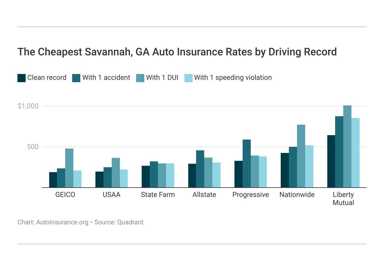 The top Savannah, GA, car insurance companies, ranked from cheapest to most expensive, are:
